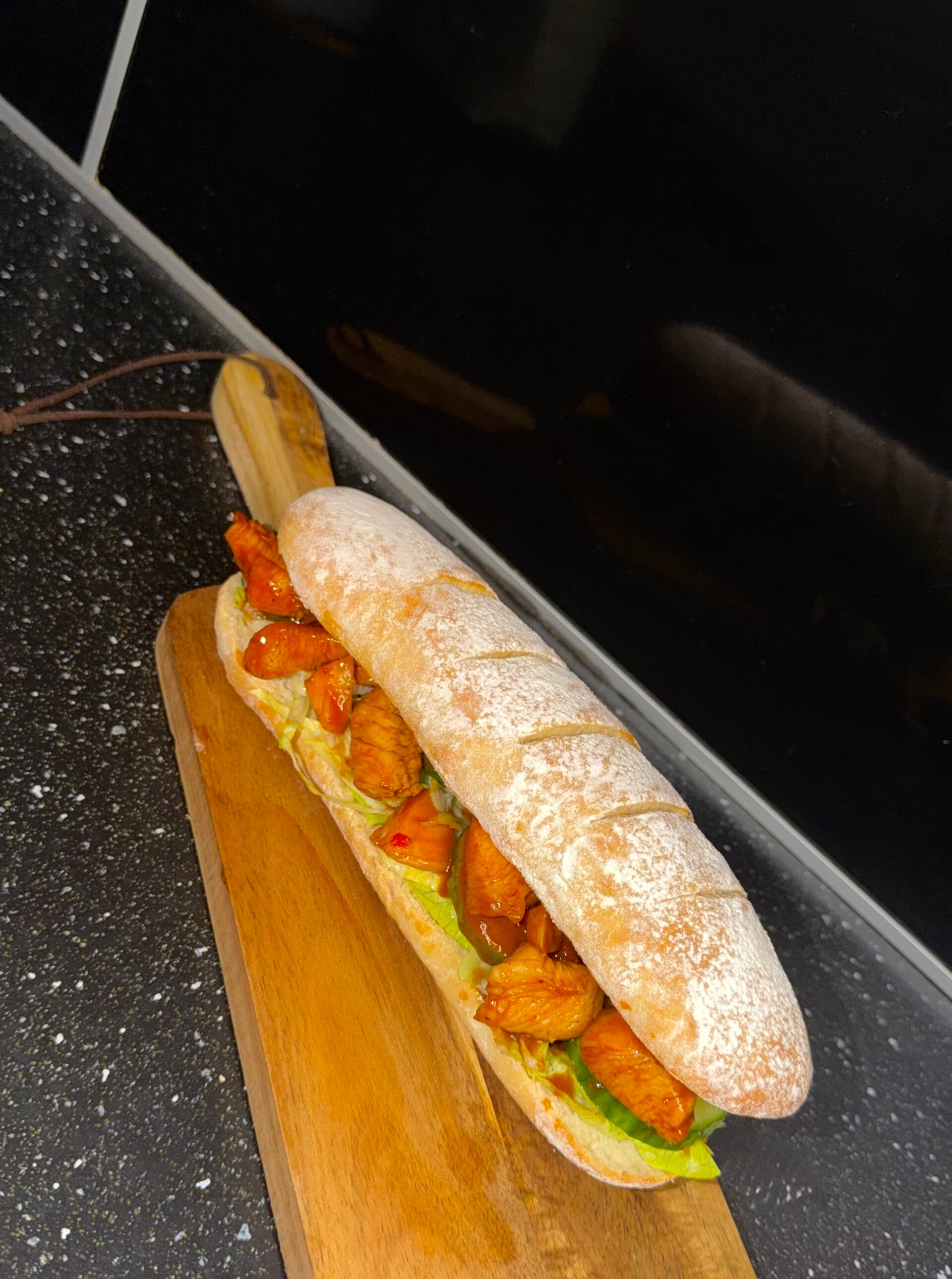 Een broodje gevuld met kipfiletblokjes, sla en komkommer.